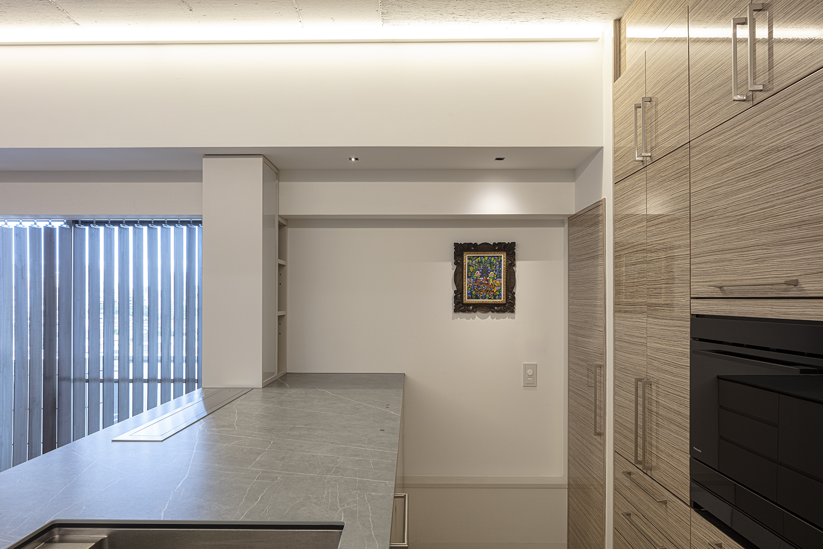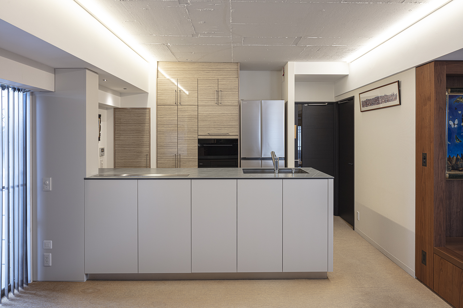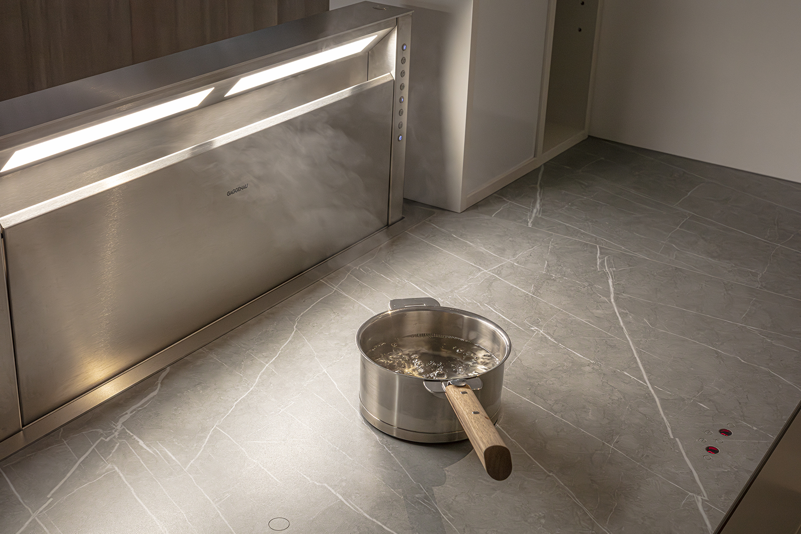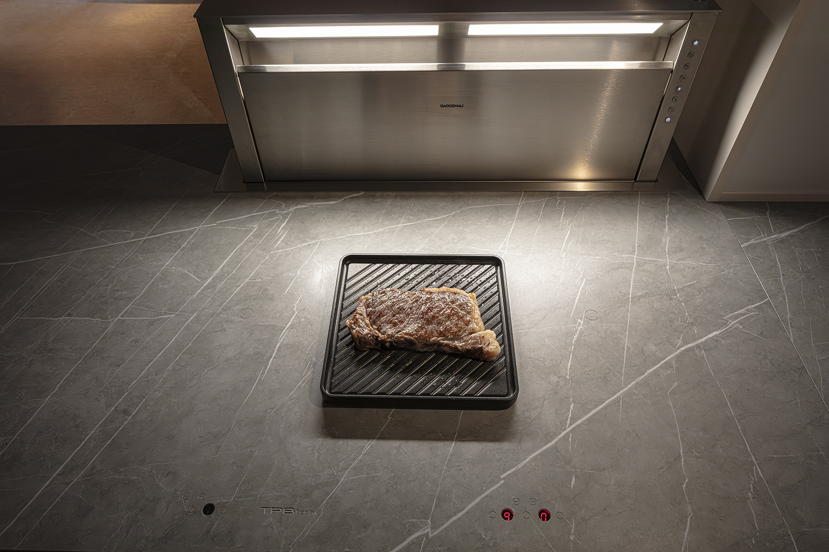 個人邸のアイランドキッチン天板に、見えないIH「TPB tech」が採用されました。表面にはNeolithのザハストーンが使用されています。